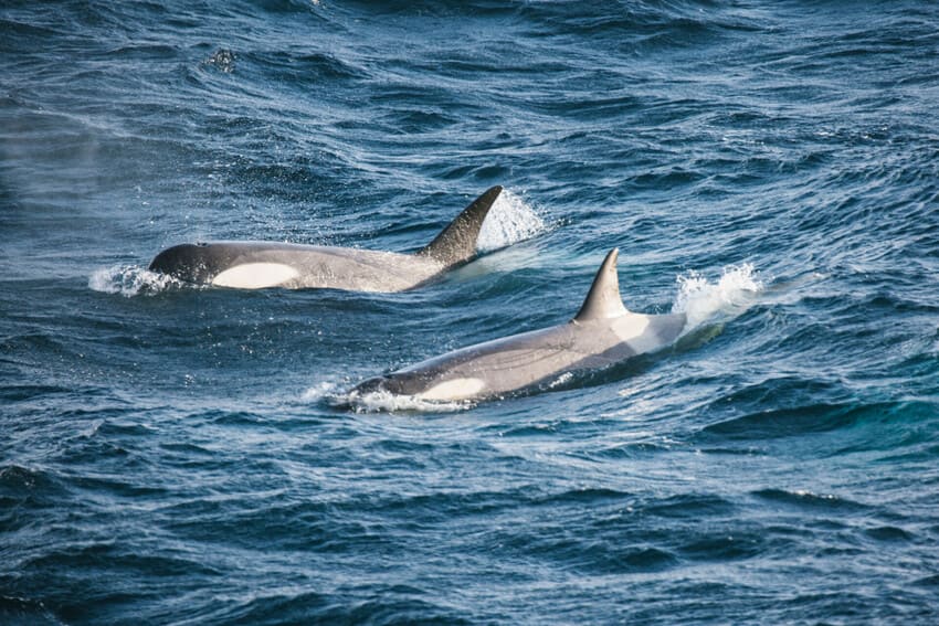 While differences in appearance may be subtle, each ecotype has its own distinctive features. Due to different feeding habits that developed over millions of years, several ecotypes of orcas emerged, featuring genetic differences caused by food preferences and availability. The five Antarctic ecotypes differ mainly by prey preferences, with some feeding on seals, while others prefer fish, penguins or minke whales. The two North Atlantic ecotypes, found around Iceland, Scotland and Norway mostly feed on fish, other whales and some types of marine mammals. The Bigg’s killer whales (also called transient whales) distinguish themselves from other orcas by living in smaller pod families. Transient whales mainly feed on marine mammals. In comparison, southern resident killer whales feature larger families and primarily feed on fish. Offshore Orcas, which live in large pods of up to 50 individuals, often feature worn-down teeth, as their diet includes sharks, known for their tough skin.