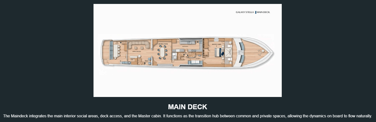 The Master cabin, located on the Maindeck, is the yacht’s main suite, designed for the owner and their family. Its design prioritizes spaciousness and privacy, with a precise layout that balances comfort and functionality in each area. It includes a double bed, a generously sized bathroom with double shower, and a separate study, creating a distinguished and private environment. Designed for those who appreciate large spaces and life on board with maximum comfort, this suite offers a superior level of livability, accompanied by the natural rhythm of the sea.